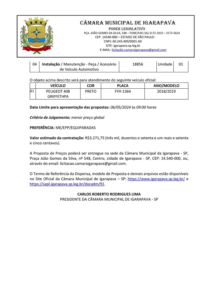 Aviso de Contratação Direta - Dispensa de Licitação 03.2024 - Proc. Adm. 15.2024 - Aquisição de Peças e Manutenção Automotiva (compressor)1.jpg